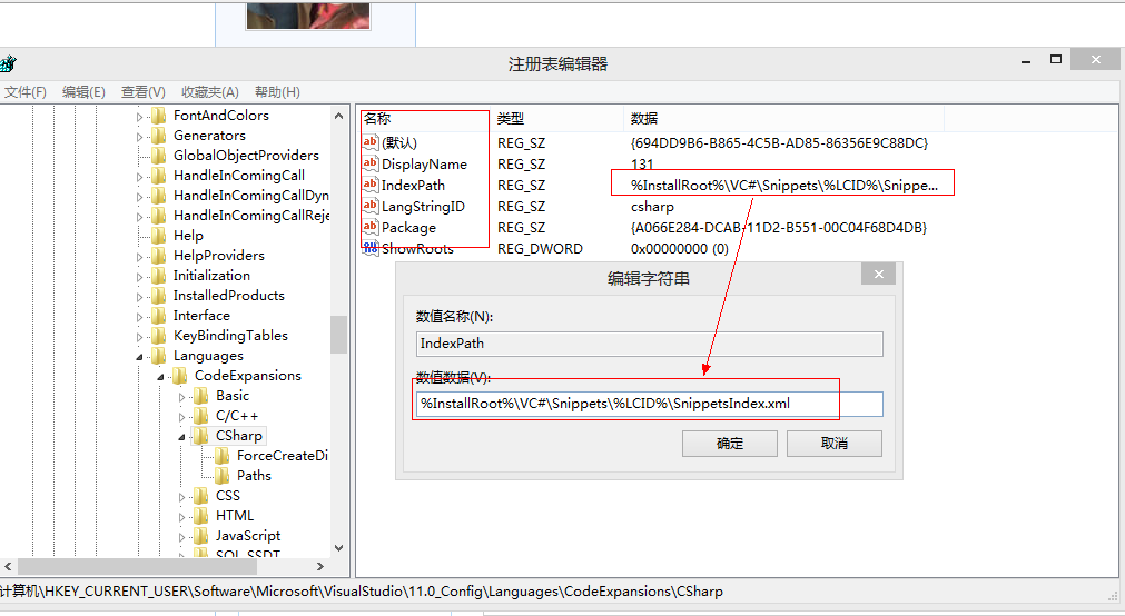 HKEY_CURRENT_USER\Software\Microsoft\VisualStudio\11.0\Languages\CodeExpansions\Visual C#子键下有一键值对,