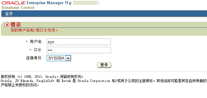 RT 登录OEM提示用户名密码错误 但是sqlplus plsql都能连 说明用户名密码肯定没错的 如图