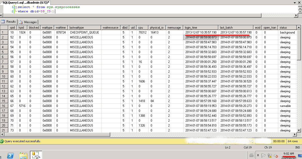 --> 返回的进程信息不同,建议用sys.dm_exec_sessions.