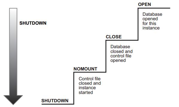 实例已经开启,并且通过读取数据文件关联了一个数据库。数据库为关闭状态,还无法被正常使用。