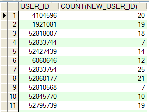 select user_id, count(new_user_id) from award_reg_record arr where user_id not in (select user_id from award_get_record agr where agr.item_id=101) group by user_id having count(*) > 5