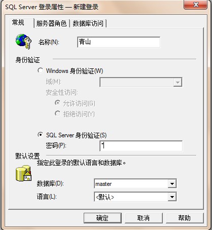 我们一般用sa(登录名)或Windows administration(Windows 集成验证登陆方式)登陆,这种登录名具有最高的服务器角色,也就是可以对服务器进行任何一种操作,而这种登录名具有的用户名是dbo(系统弄的),也就具有对所有用户创建的数据库中的数据进行一切的操作的权限,所以,一般我们感觉不到上述那些东西,但是,他们确实存在。一般我们通常创建用户名与登录名相同(如果我们不改变用户名称的话,系统会自动弄上登录名和用户名相同,这个不是强制相同的),例如创建了一个登录名称为“青山”,那么可以为该登录名“青山”在指定的数据库中添加一个同名用户,使登录名“青山”能够访问该数据库中的数据。一个登录名可以对应多个用户名,多个用户名的数据库角色可以分别选择,但是,一个登录名在一个数据库上最多可以创建一个用户名。
