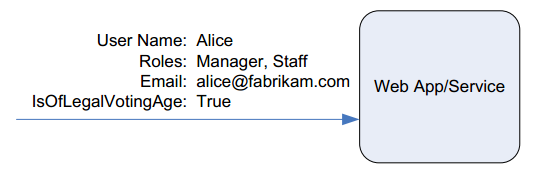 当创建声明感知(claims-aware)的应用程序时,用户向程序出示他的身份标识,标识以一组声明来表示(见图1)。一个声明可能是用户名,另一个声明可能是电子邮件地址。此处的想法是一个外部的标识系统被配置来对于用户发起的每一个请求,都为程序提供它所需要知道的用户信息,以及接收到的标识数据都经过受信任来源的加密保护。